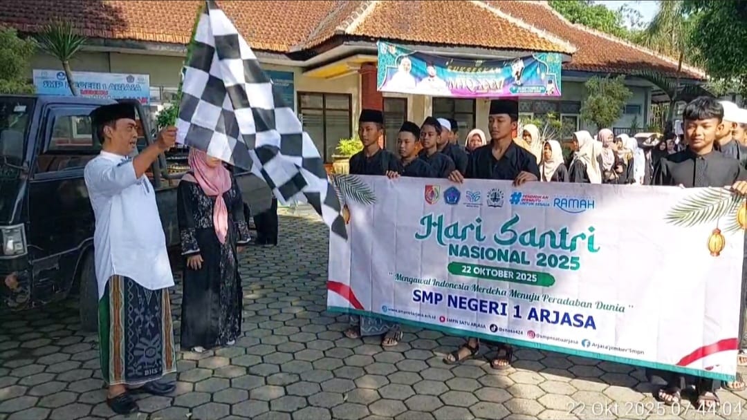 SMPN 1 Arjasa yang beralamat di Jl. Teratai No.11 Biting Kecamatan Arjasa Kabupaten Jember memperingati hari santri dengan mengadakan giat apel dan kirab berjalan kaki dari SMPN 1 Arjasa menuju lapangan Biting diikuti oleh 600-an siswa, dewan guru dan tenaga kependidikan, Rabu-22/10/2025.