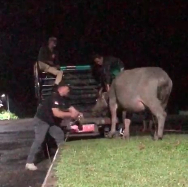 Demi Menegakkan Perda Hewan Ternak tersebut. terlihat para anggota Satpol PP Kaur, sedang melakukan penangkapan seekor kerbau, dan siap diamankan di sebuah mobil untuk di bawa ke rumah penampungan hewan dikantor Satpol Kaur, pada Sabtu malam (28 /02/ 2026)